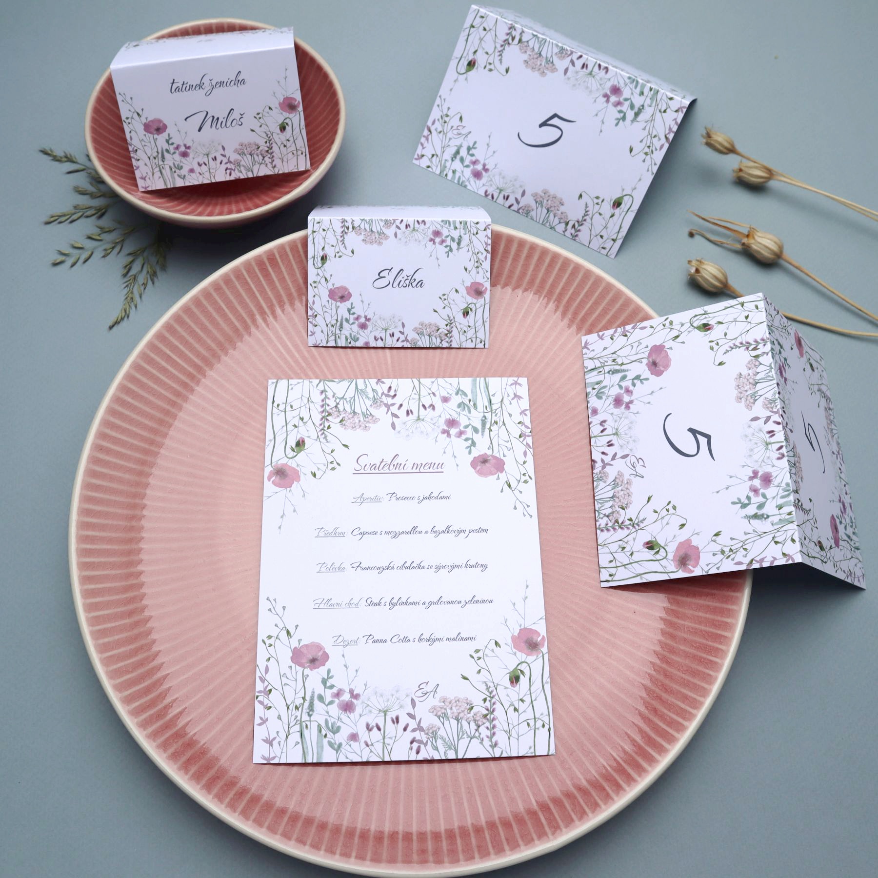 Tiskoviny na svatební stůl s motivem lučních květů, doplněné zelenými a růžovými saténovými stuhami, k dekoru se bude hodit i stuha bílá.