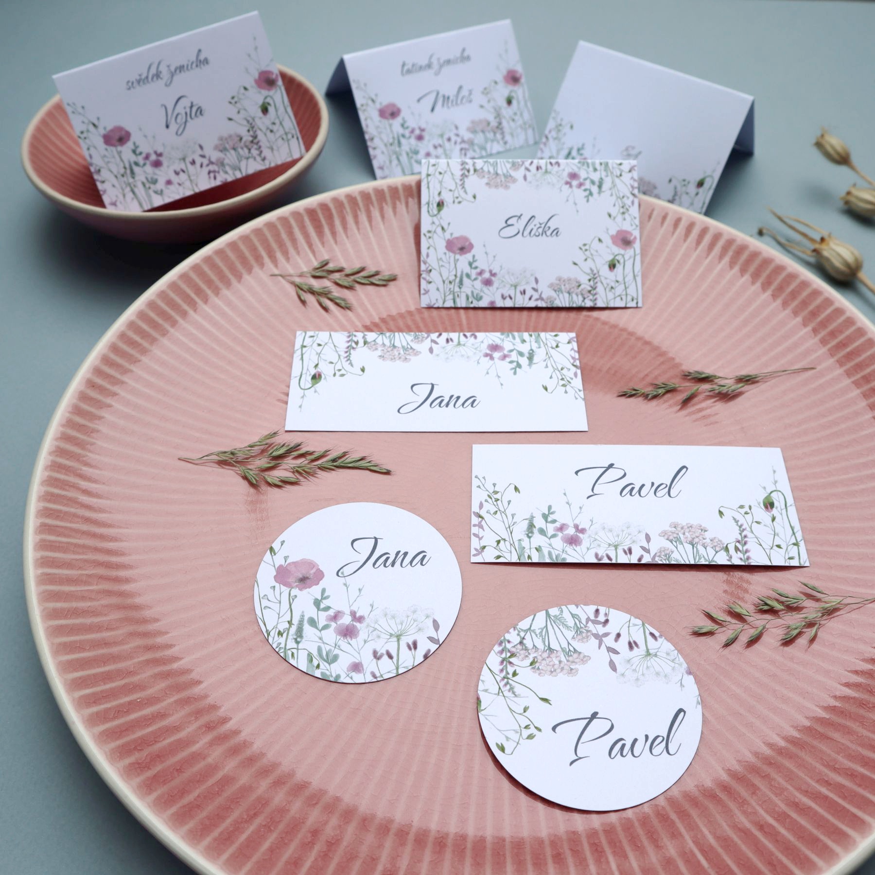 Můžete mít dlouhé menu spojené se jmenovkou nebo samotnou kulatou nebo obdélníkovou jmenovku se stužkou i bez stužky.