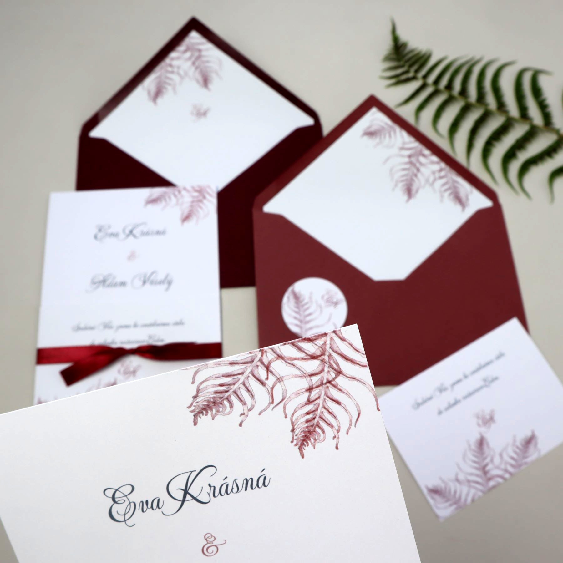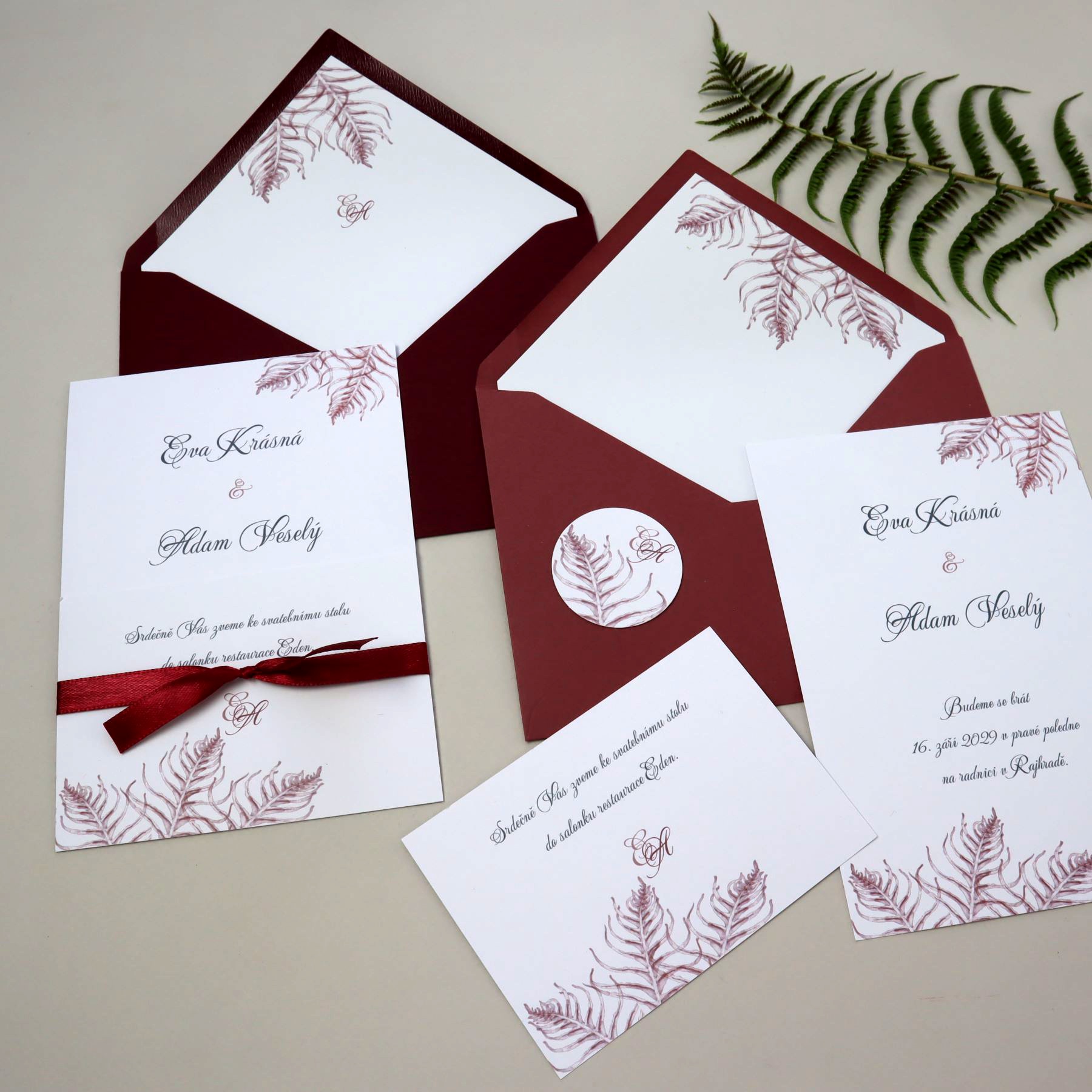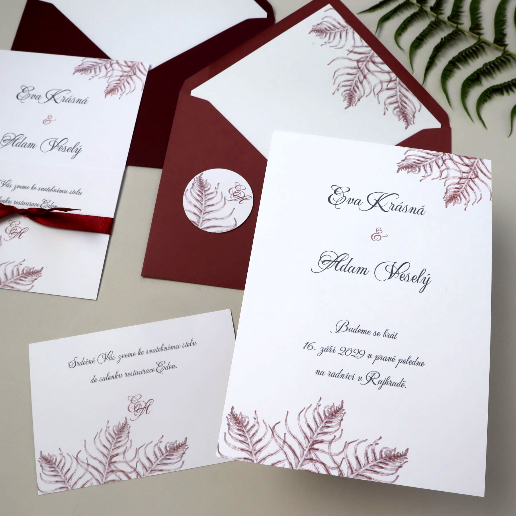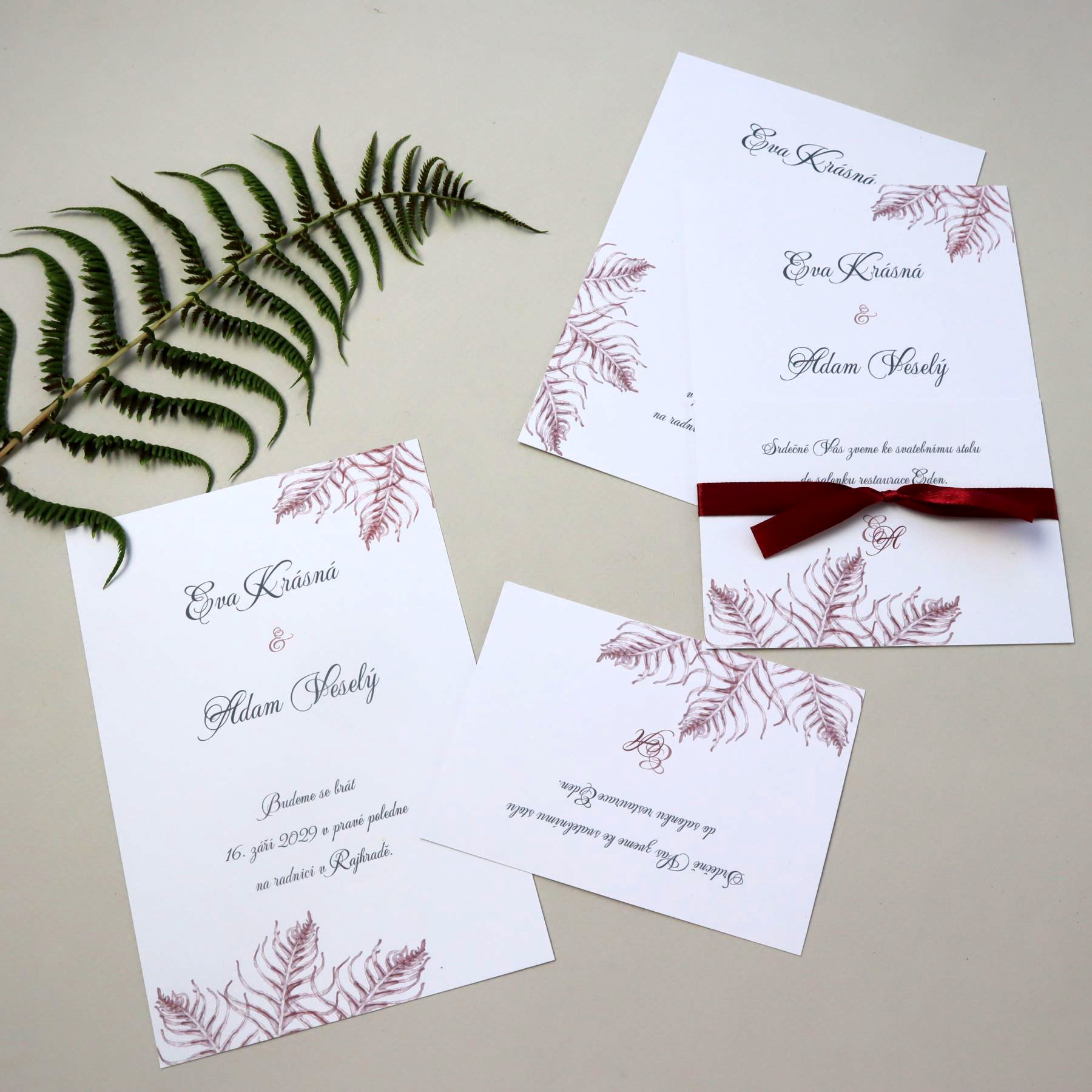 Autorská grafika s motivem větviček kapradí v bordó nebo královské modré pro Váš svatební den...