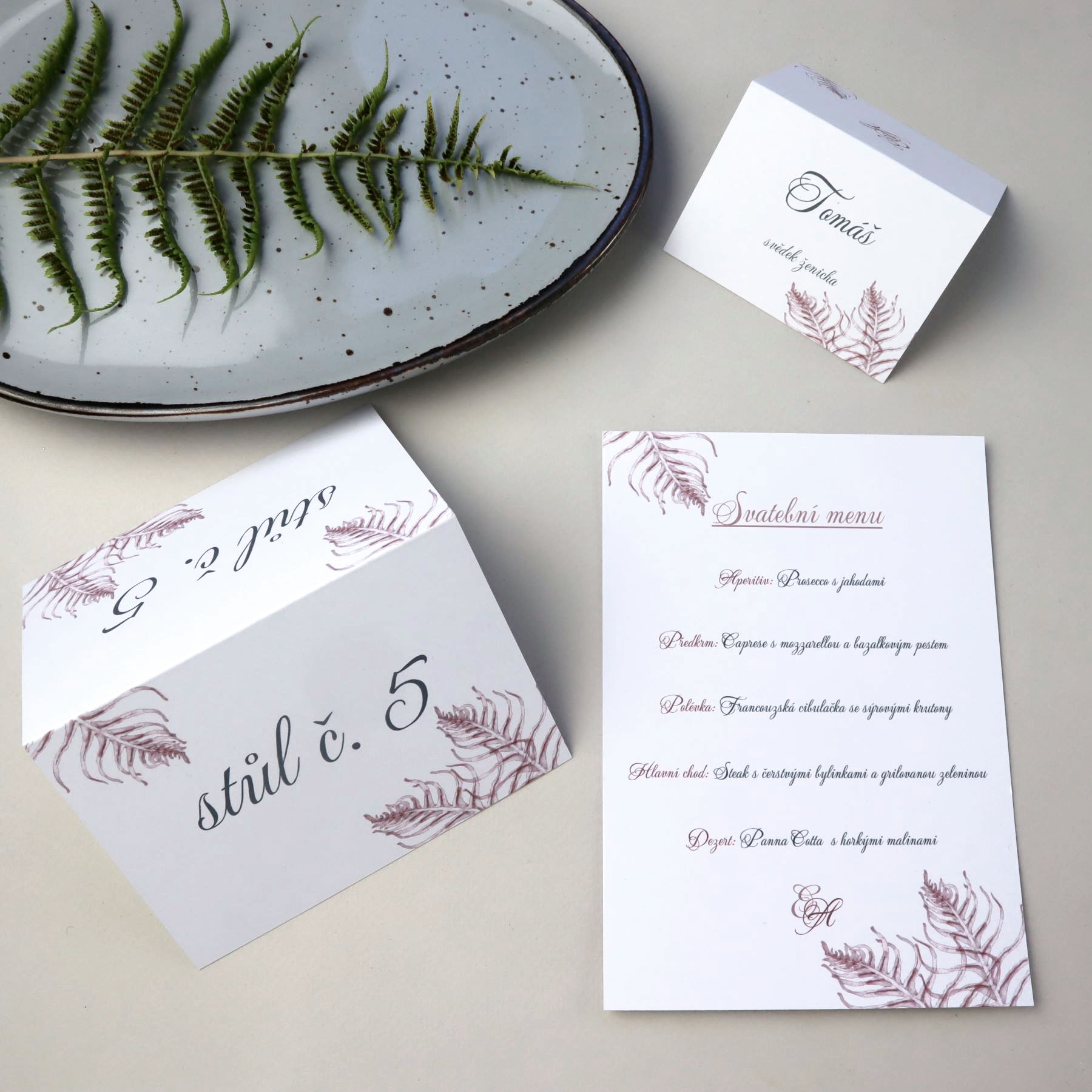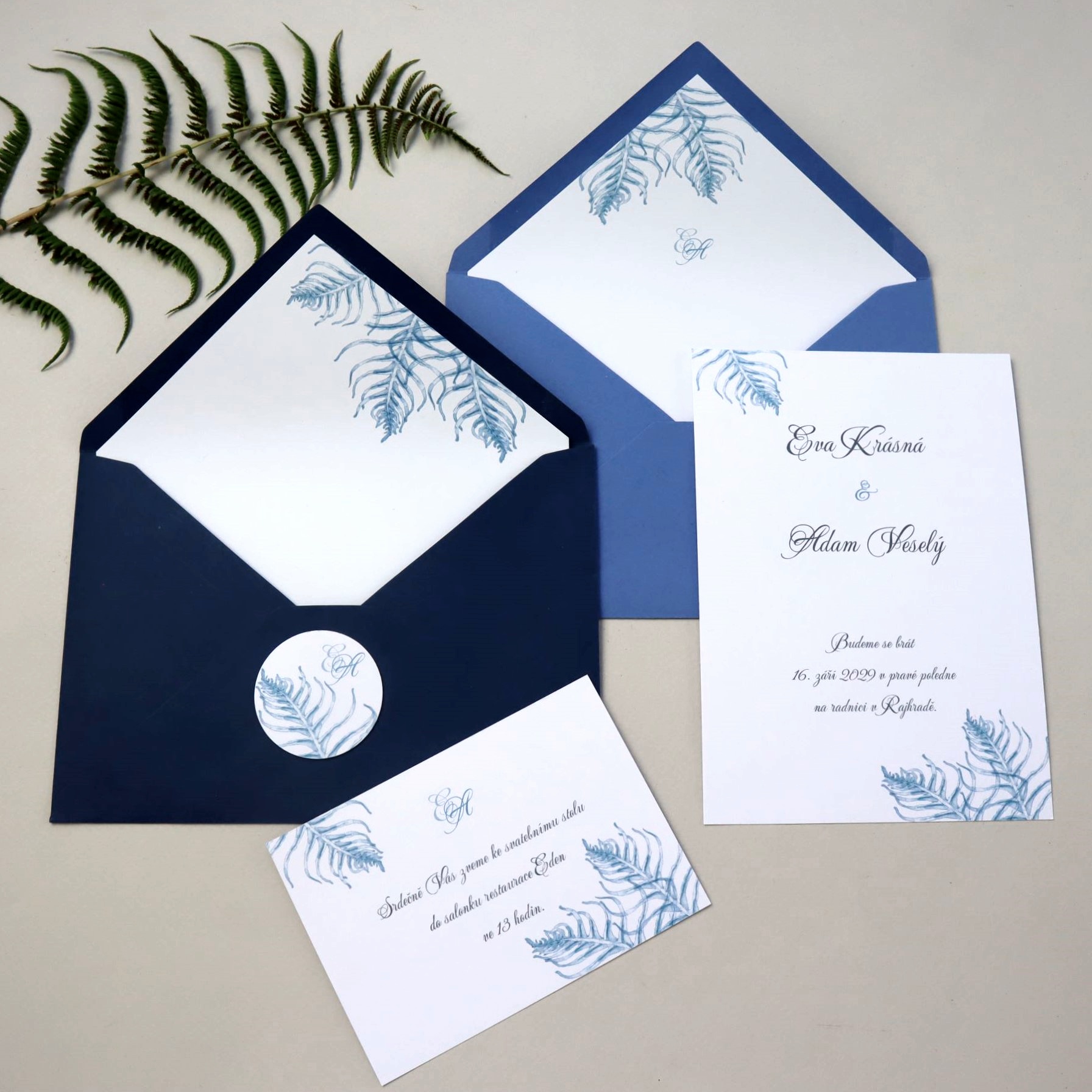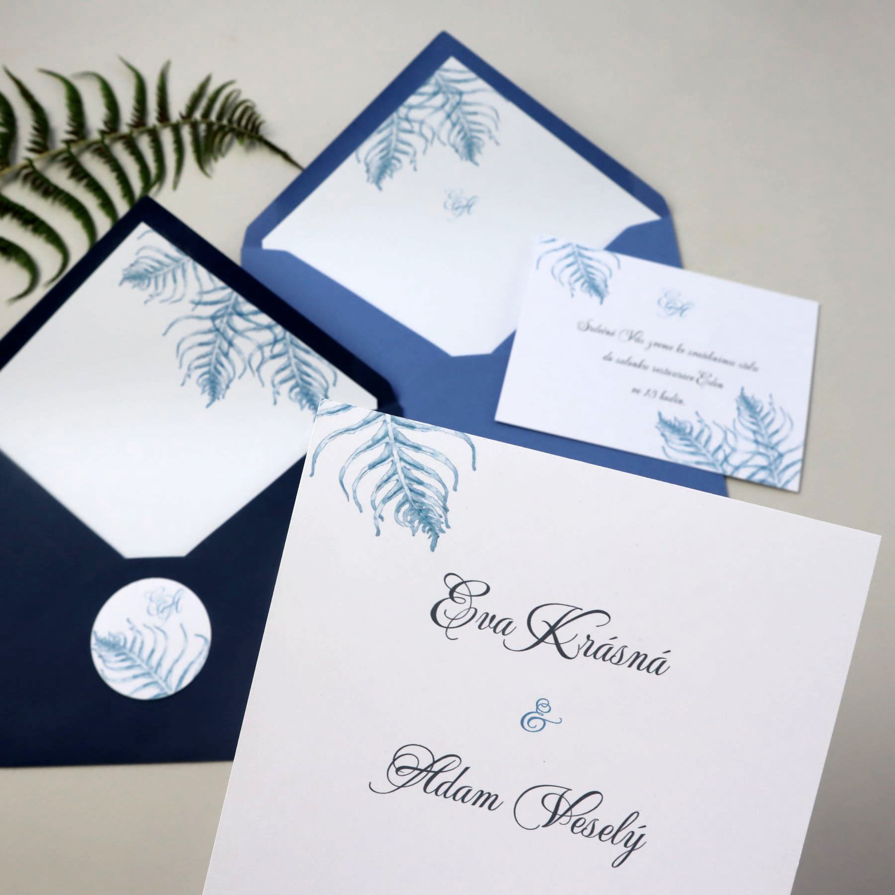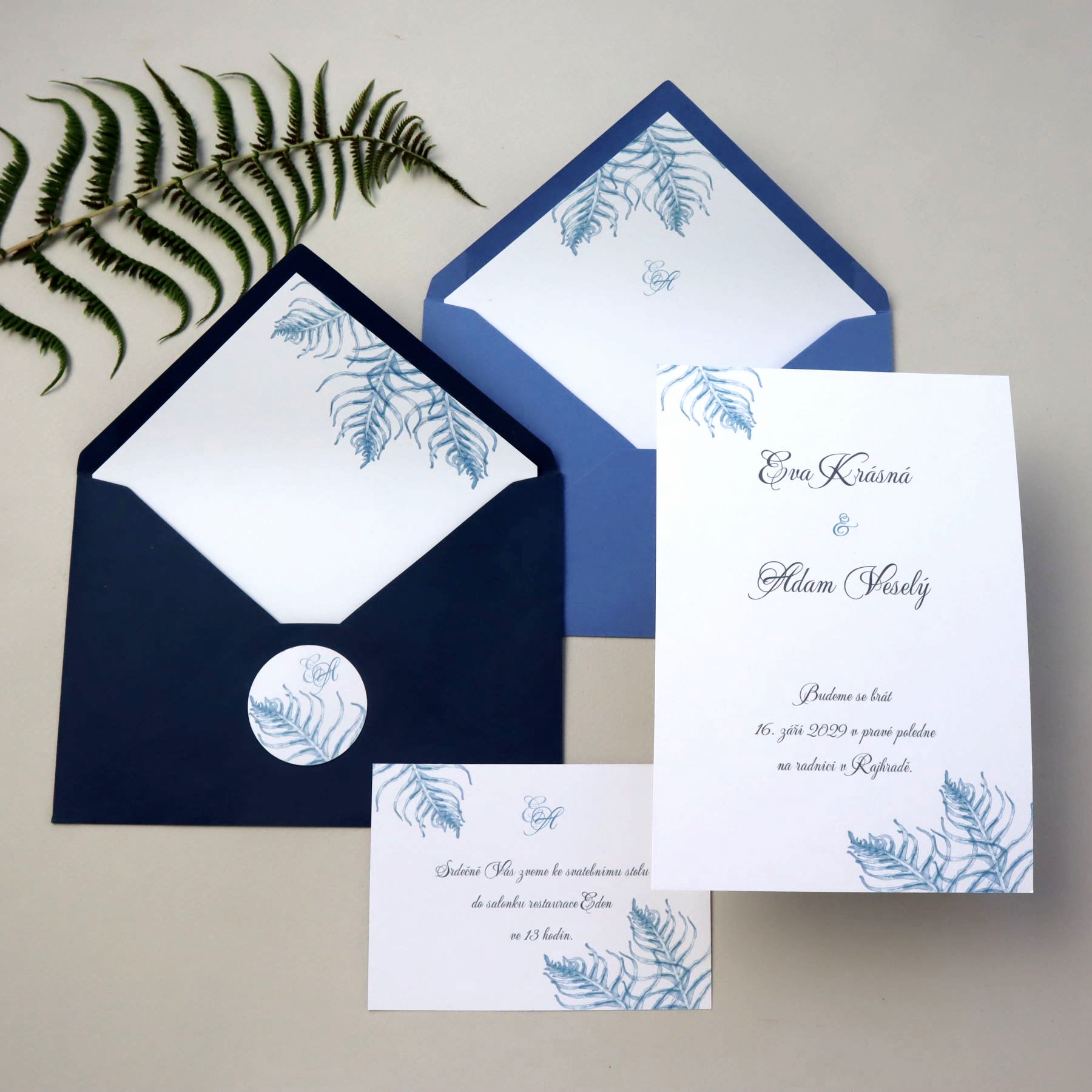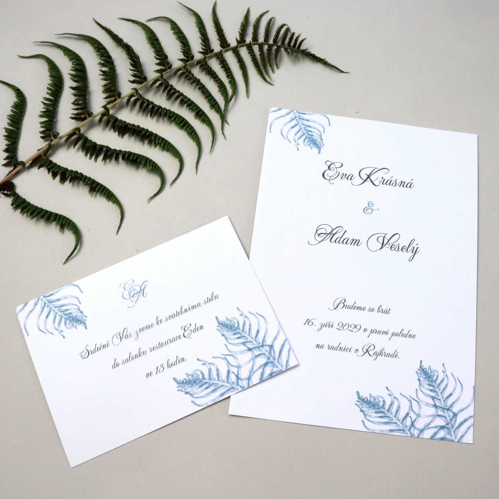 Autorská grafika s motivem větviček kapradí v bordó nebo královské modré pro Váš svatební den...