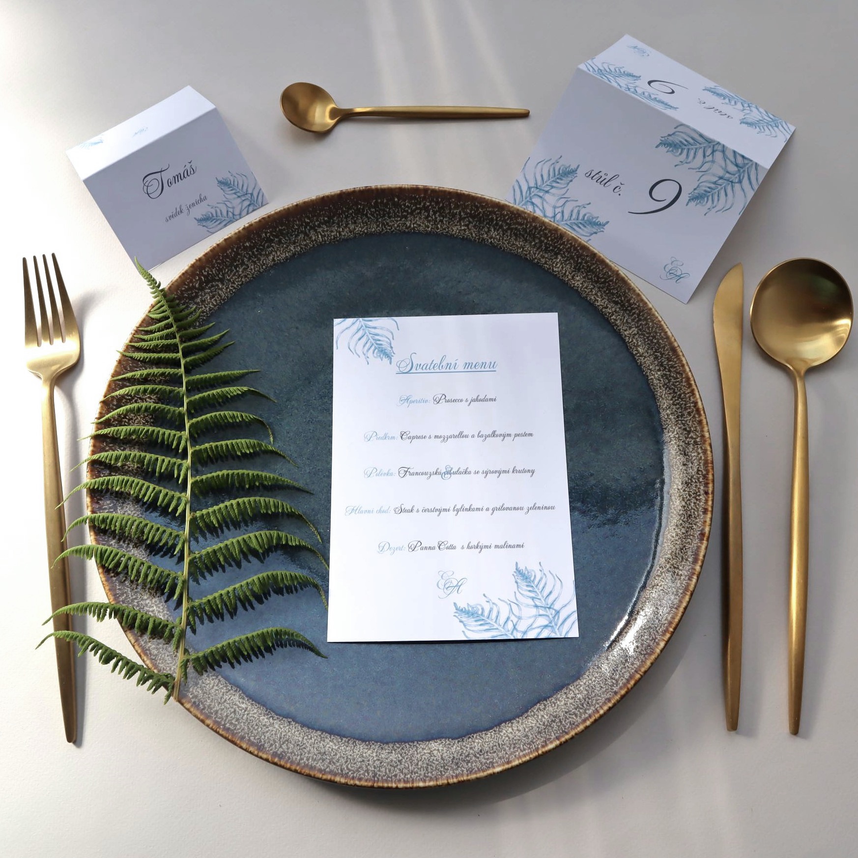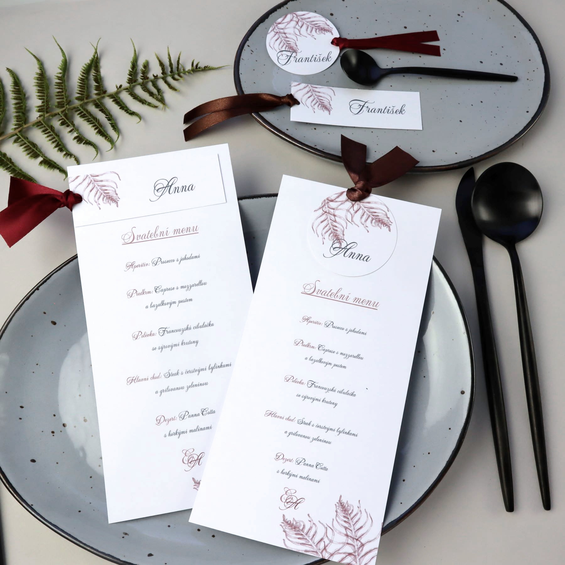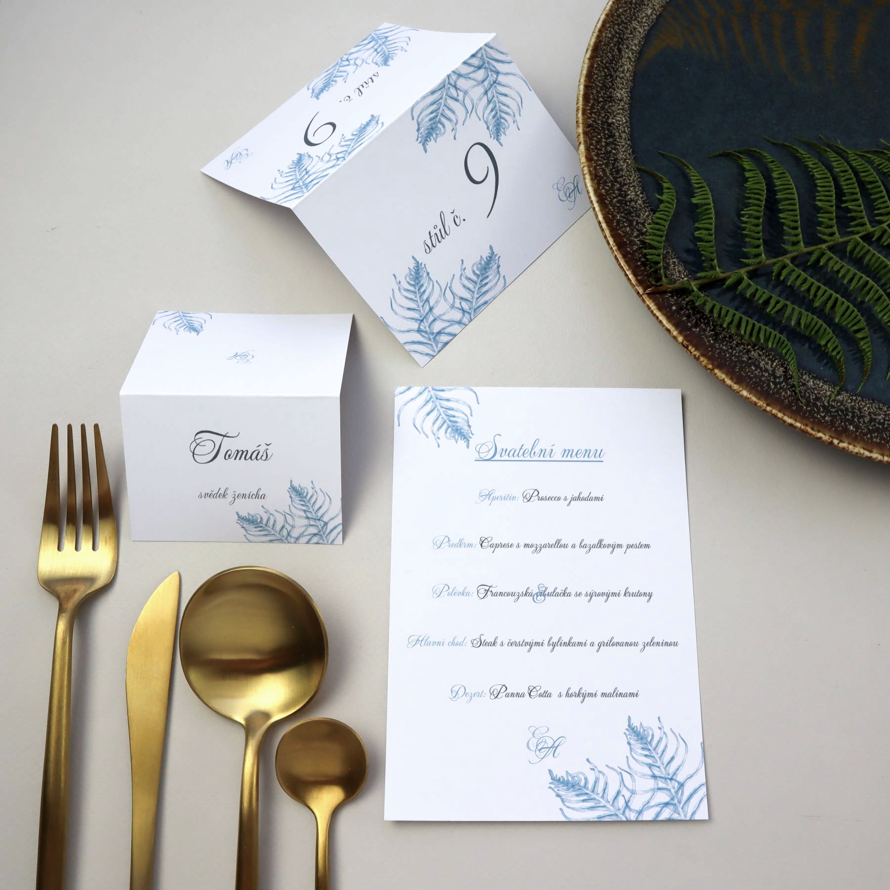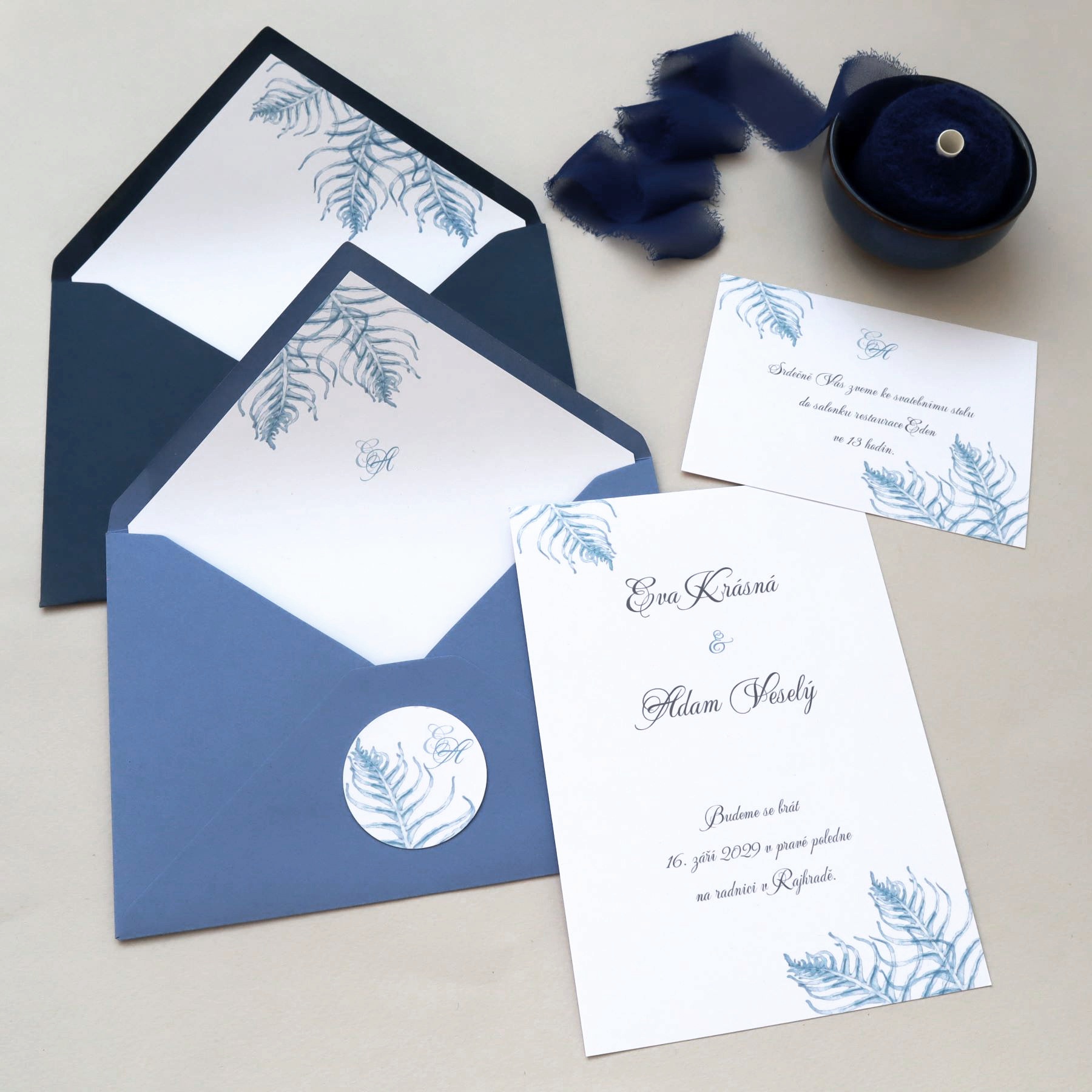 Autorská grafika s motivem větviček kapradí v bordó nebo královské modré pro Váš svatební den...