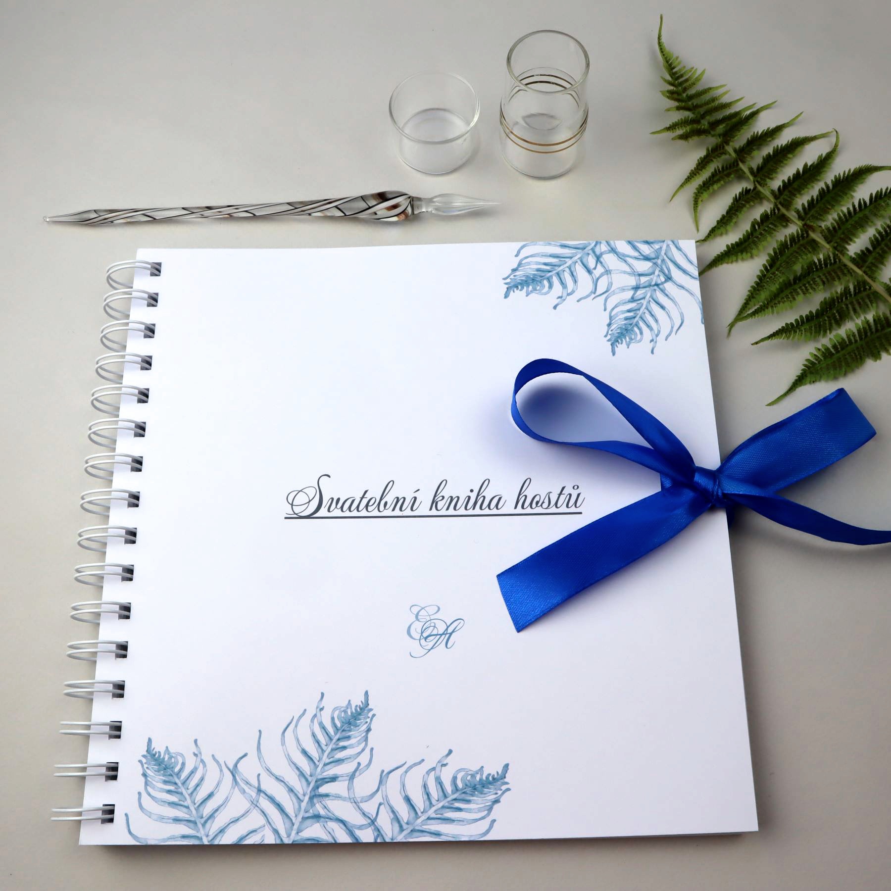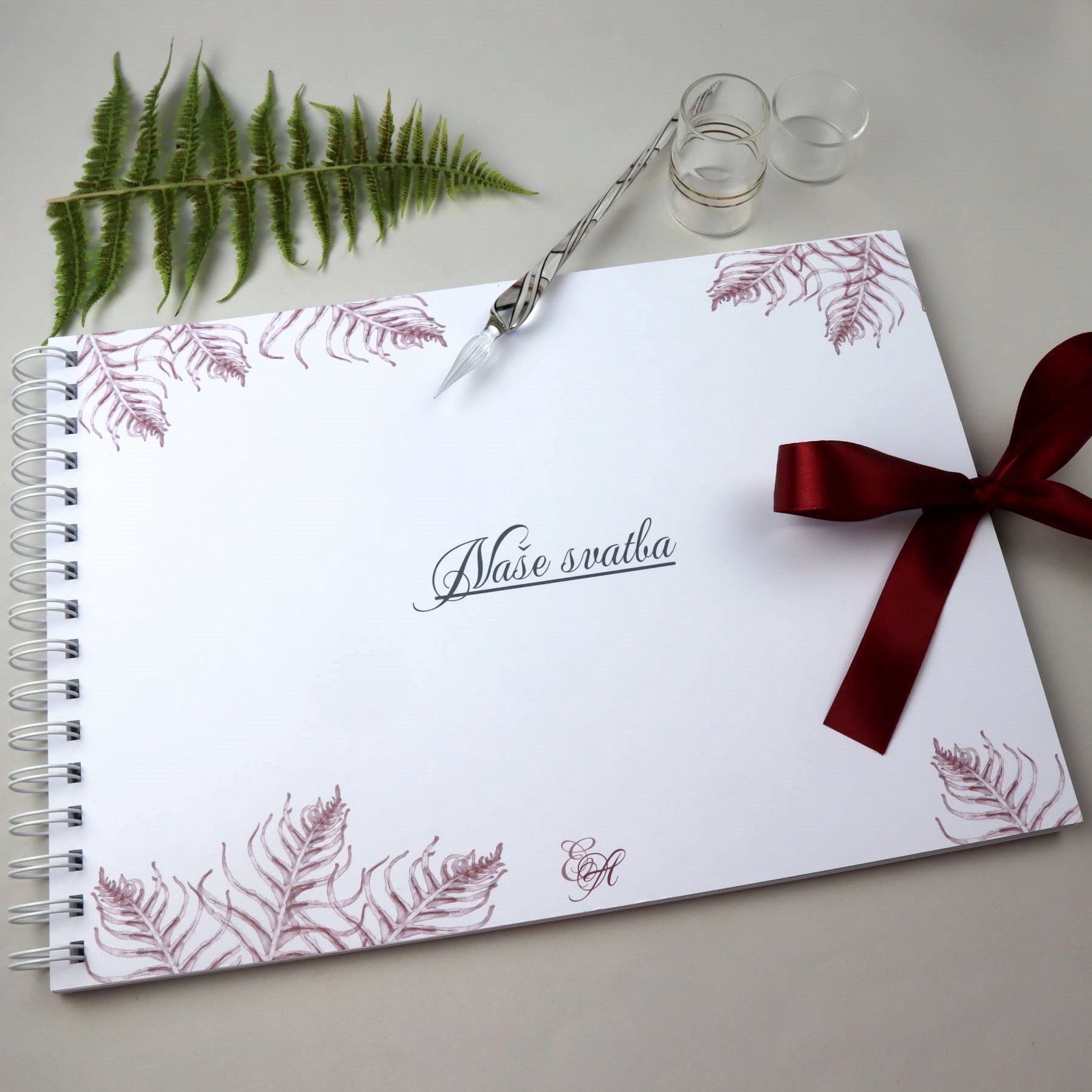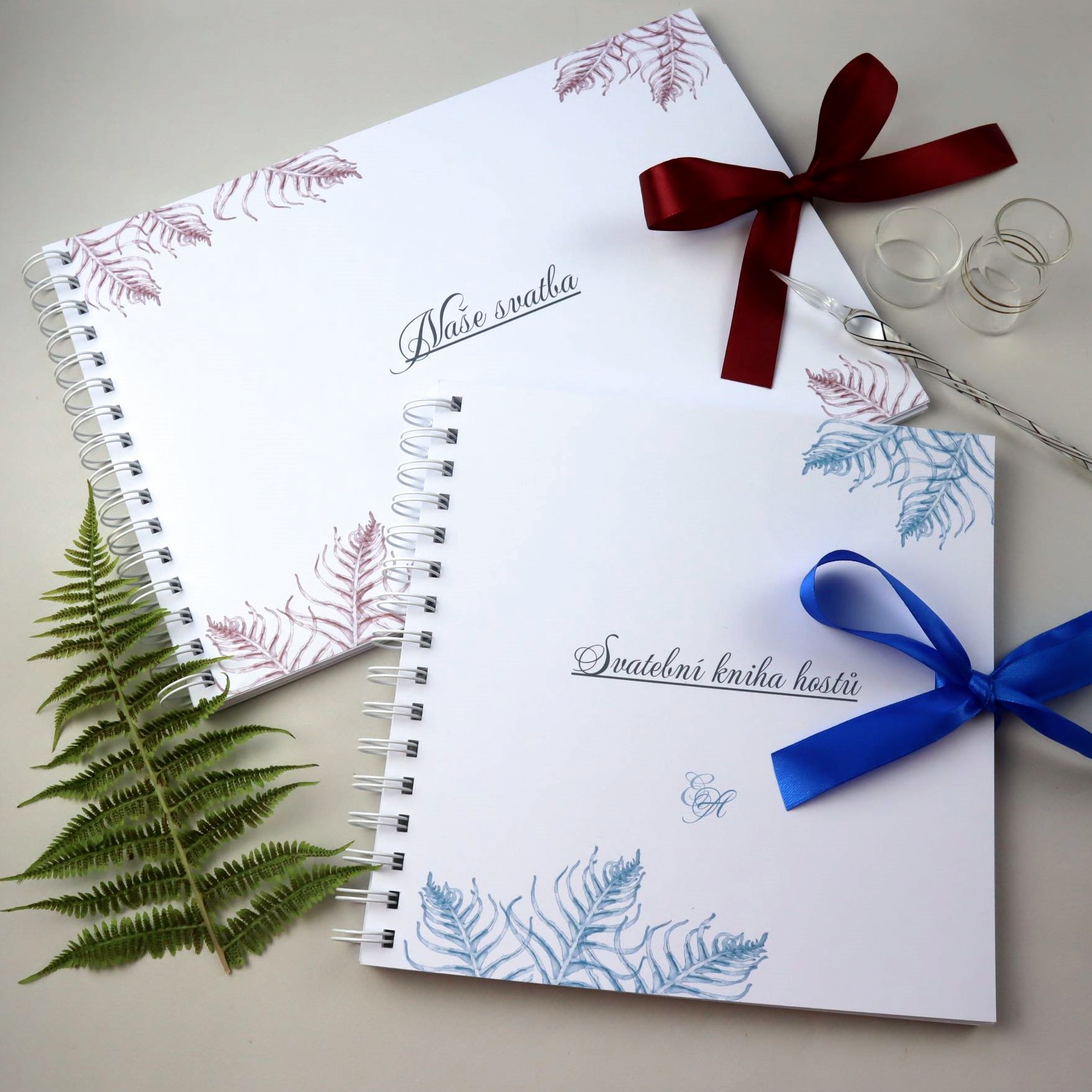 Svatební kniha hostů nebo album s motivem kapradinek v bordó nebo modré barvě. Univerzální dekor, který se bude hodit ke každé květinové výzdobě.